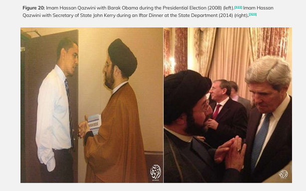 Imam Hassan Qazwini (også med tette bånd til Iran) sammen med Barak Obama under presidentvalget (2008) og med utenriksminister John Kerry under en iftar-middag i utenriksdepartementet i 2014.