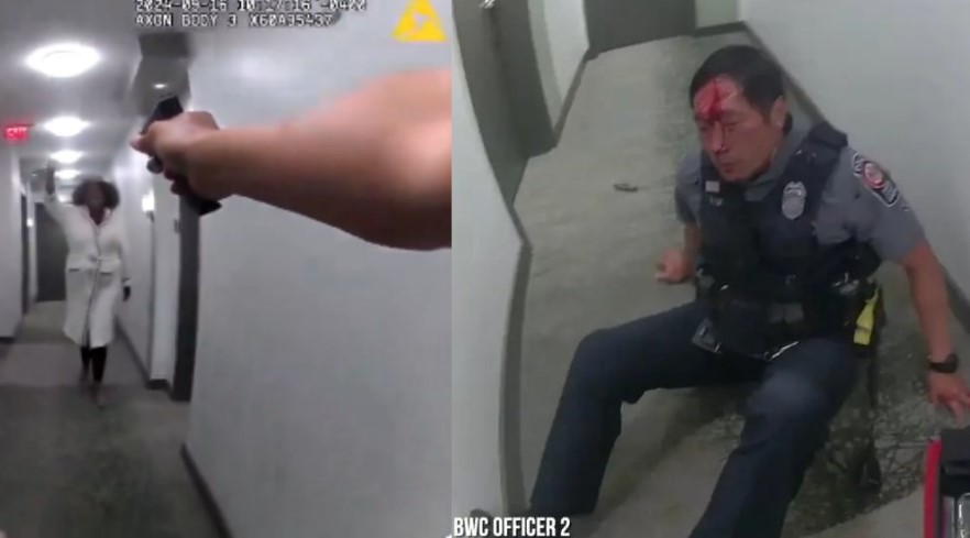 En video fra et kroppskamera fanget opp øyeblikket da en 1,80 meter høy kvinne ble skutt av en politimann i Virginia bare sekunder etter at hun angrep ham med en kniv og skar ham gjentatte ganger. New York Post skriver om saken.