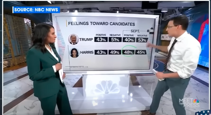 Kamala hadde 48 prosent positive i september. De har falt til 43 prosent i oktober. Det går altså gale veien, mens trenden er motsatt for Trump, og da har vi ikke sett på vippestatene, hvor det går enda bedre for Trump.