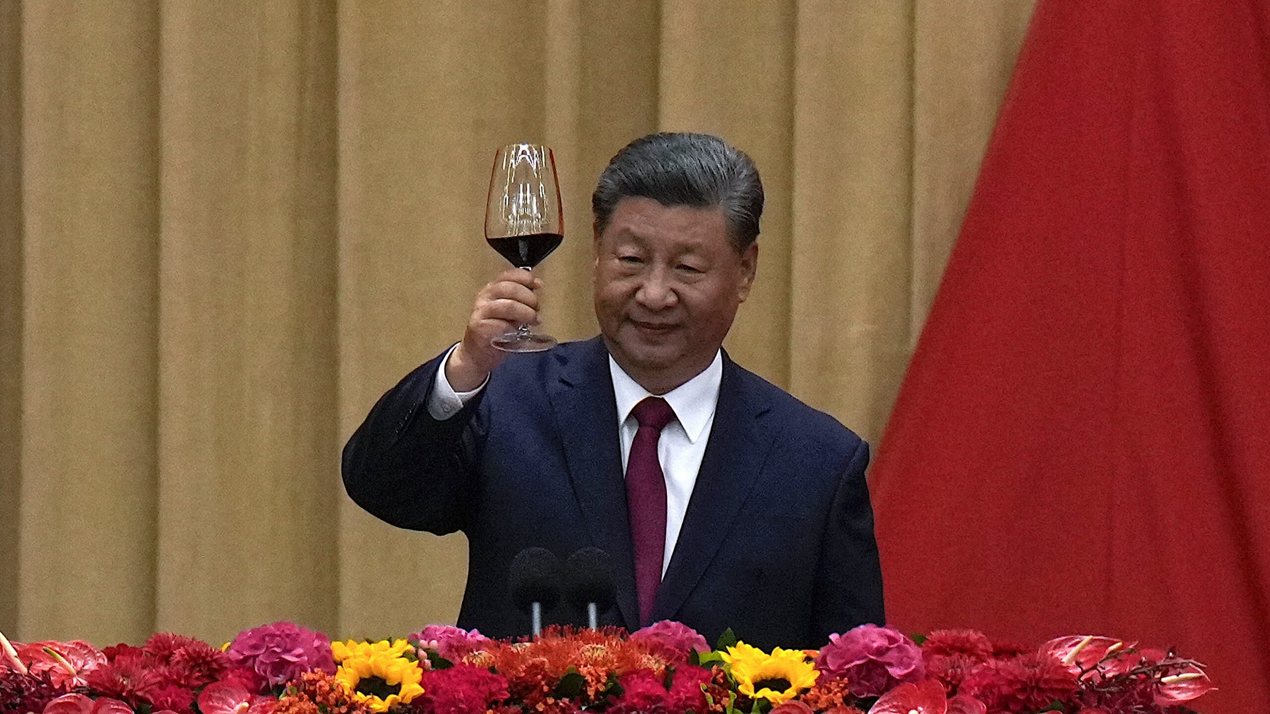 Kinas president Xi Jinping utbringer en skål etter å ha talt ved 75-årsjubileet for Folkerepublikken Kina i Folkets store hall i Beijing den 30. september 2024. Foto: Andy Wong / AP NTB.