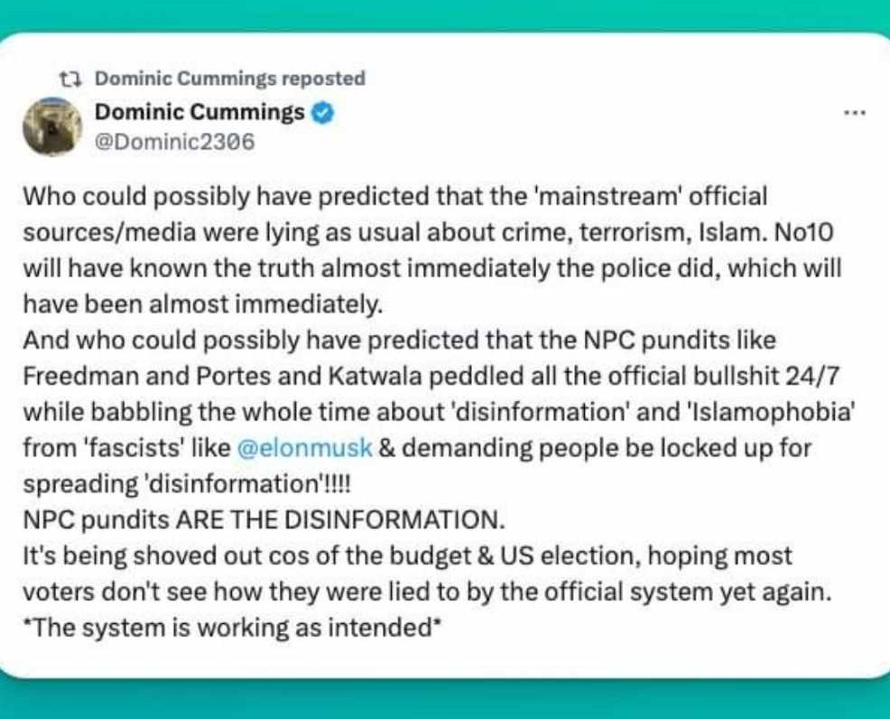 «Hvem kunne forutsett at «hovedstrøms» offisielle kilder/media løy, som vanlig, om kriminalitet, terrorisme, islam. Nummer 10 (Downing Street, red. anm.) vil ha visst sannheten nesten samtidig som politiet, det vil si nesten umiddelbart. Og hvem kunne forutsett at «NPC» personligheter som Freedman og Portes og Katwala ville selge den offisielle bullshiten 24/7 ved dørene mens de bablet om «desinformasjon» og «islamofobi» fra «fascister» som Elon Musk og krevde at folk skulle sperres inne for «desinformasjon»!!!! NPC-personene (non player character, brukes om folk som ikke tenker selv, red. anm.) ER DESINFORMASJONEN. Informasjonen blir nå skjøvet ut på grunn av budsjettet og det amerikanske valget, de håper at de fleste velgere ikke ser hvordan de ble løyet til av det offisielle systemet nok engang. Systemet virker som planlagt.»
