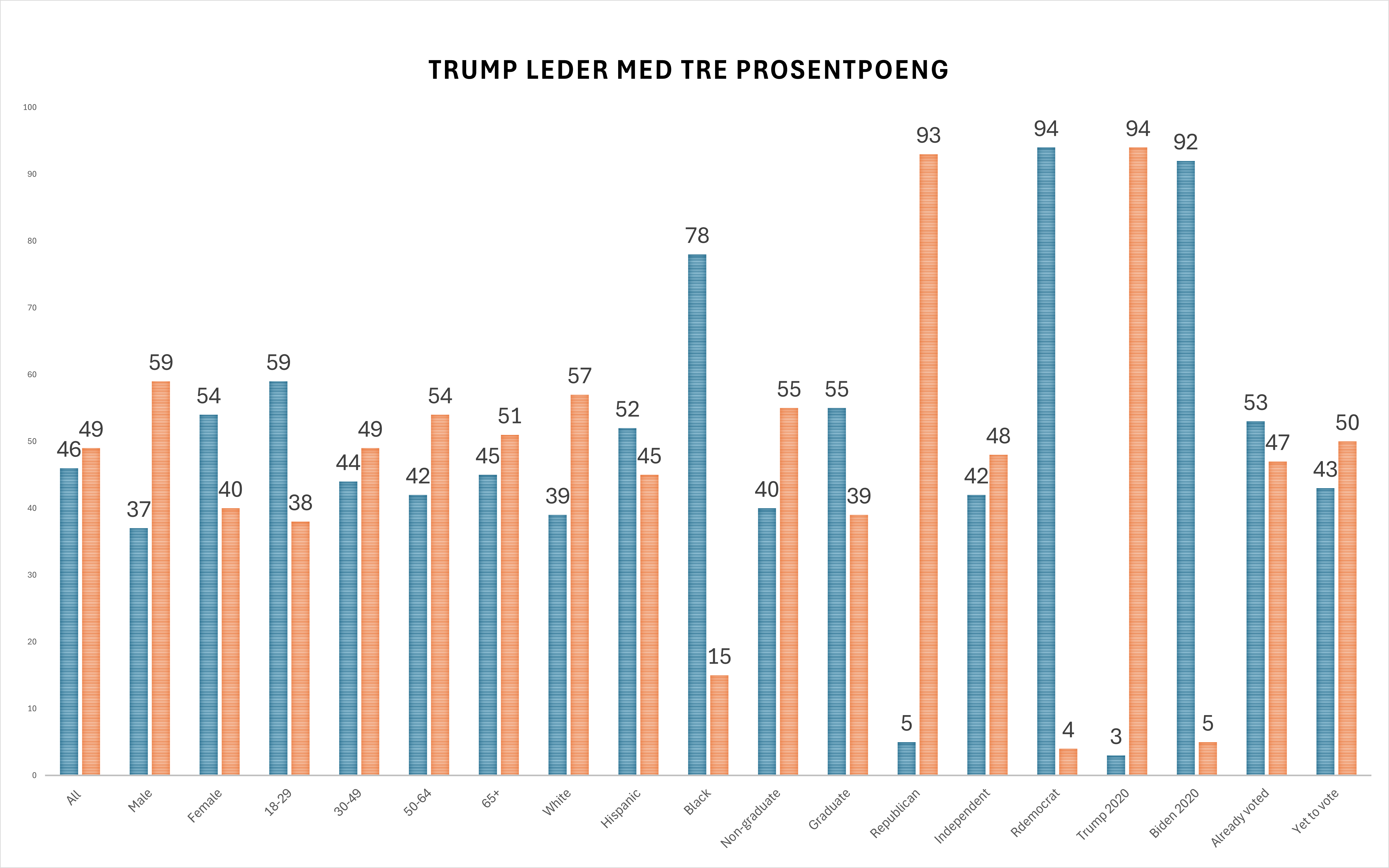 Valgdagen nærmer seg raskt, og både Trump og Harris intensiverer sine kampanjer for å sikre seg velgere. Med Trumps solide støtte i flere velgergrupper står kampen nå om mobilisering – særlig i de avgjørende vippestatene, hvor marginene kan bli svært små.