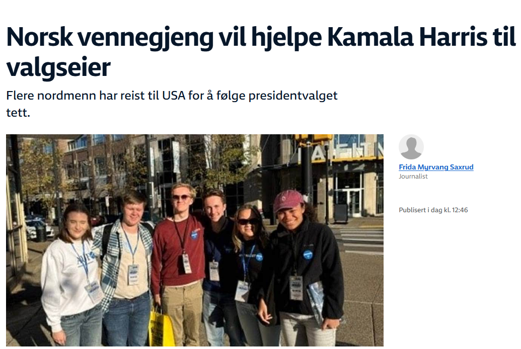 En norsk vennegjeng vil hjelpe Kamala Harris til valgseier, skriver Frida Myrvang Saxrud i NRK, som om det var det mest naturlige i verden. Alle i vennegjengen er aktive i AUF, hvor de har verv. Myrvang Saxrud skriver: