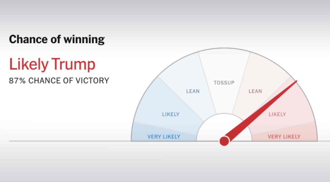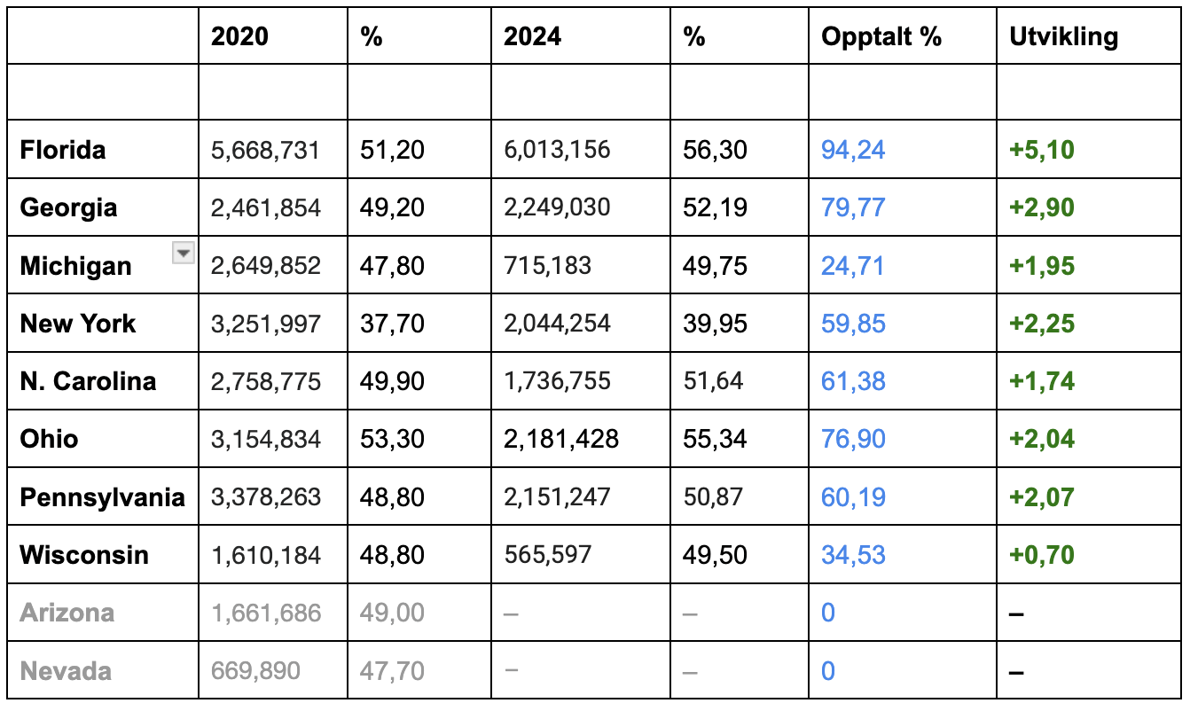 Sammenlignet med valgresultatet fra 2020 øker Trumps oppslutning med gjennomsnittlig 2,34 prosentpoeng i åtte av delstatene, inkludert de fleste vippestatene.