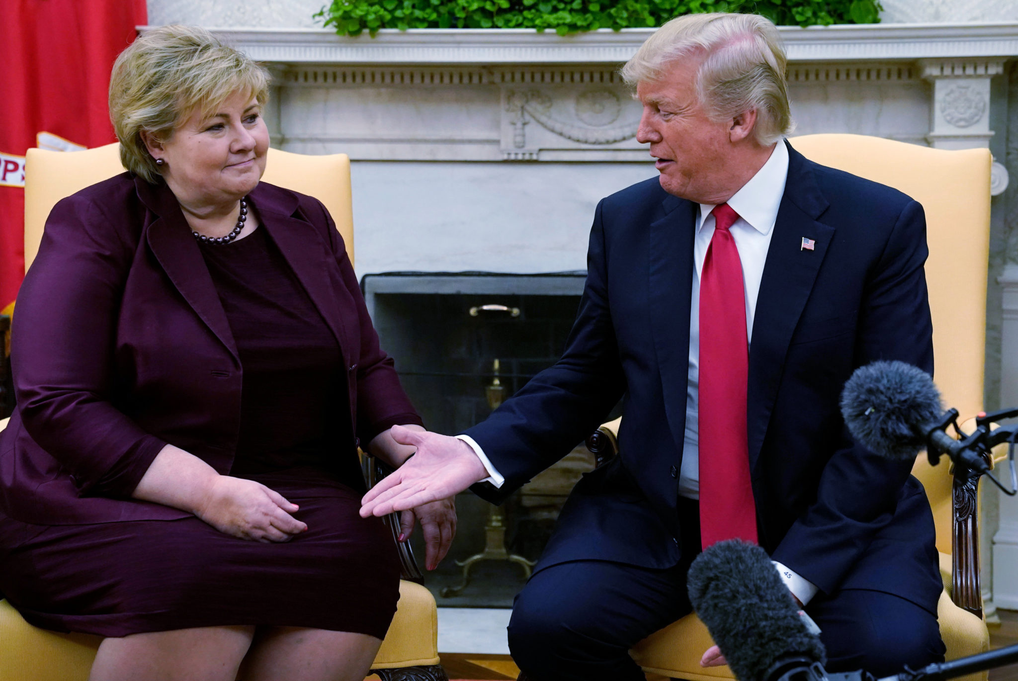 Så utdyper Erna dette mer konkret ved å nevne større saker, og her plumper Erna uti: Hun sier at når hun møter andre politikere, går samtalen om store globale saker. Har hun ikke fått med seg at Trump er anti-globalist, mens hun selv er globalist?
