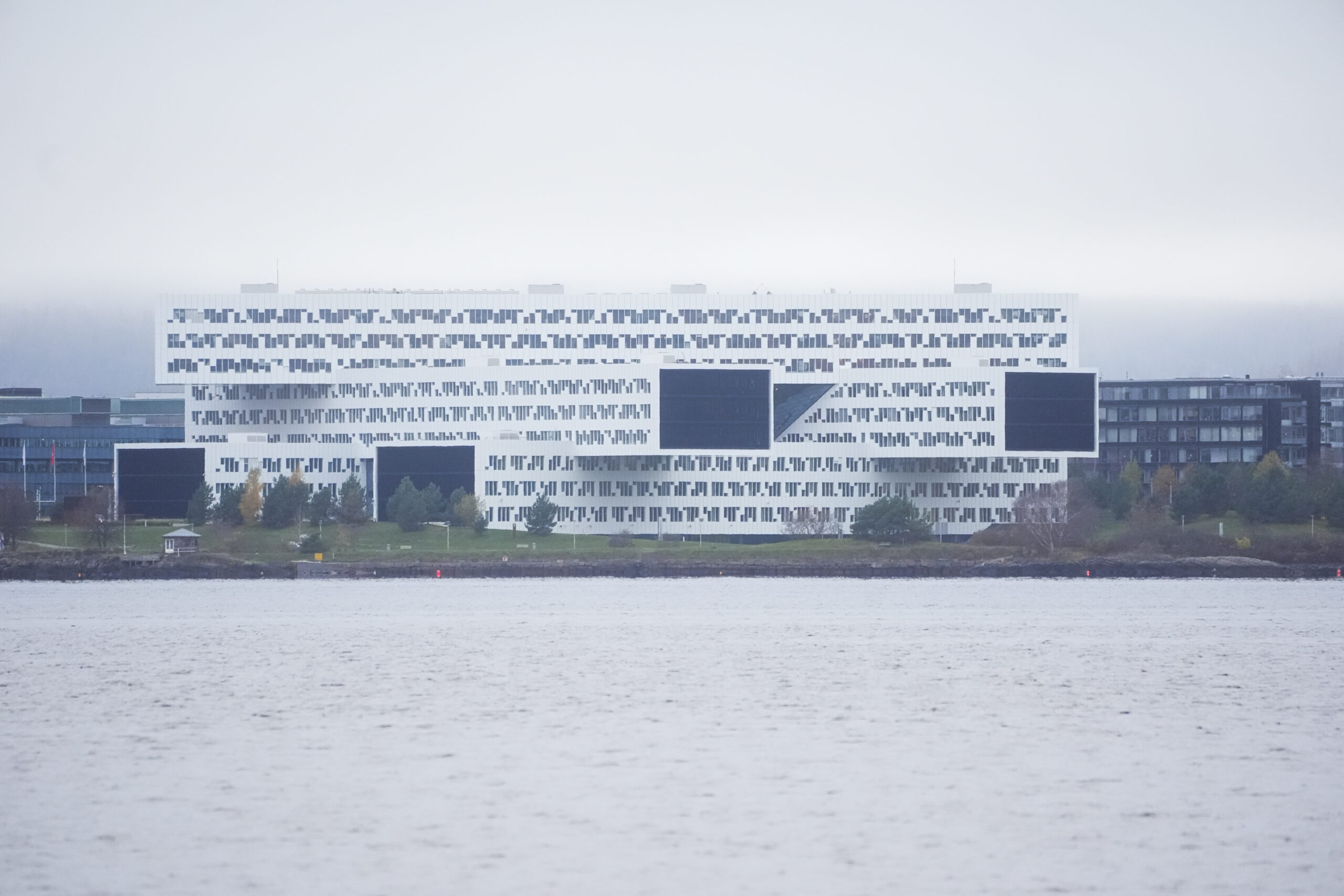 Equinor-bygget på Fornebu utenfor Oslo sett fra Huk på Bygdøy den 6. november 2024. Passer det fint inn i de naturlige omgivelsene, slik loven krever? Foto: Terje Pedersen / NTB.
