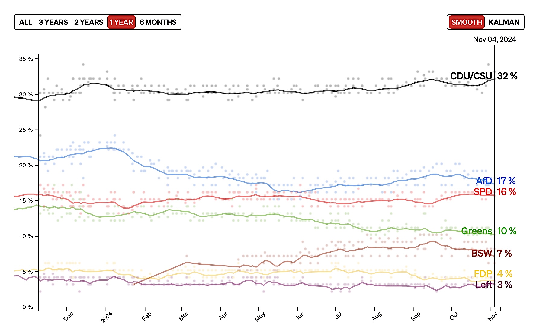 Det antydes et nyvalg i mars, og CDU ligger sammen med sitt bayerske søsterparti (CSU) høyt over de andre partiene på meningsmålingene. Men de vil ikke bli i stand til å regjere alene, hvilket reiser spørsmål om hvem som skal utgjøre Merz-regjeringens parlamentariske grunnlag.
