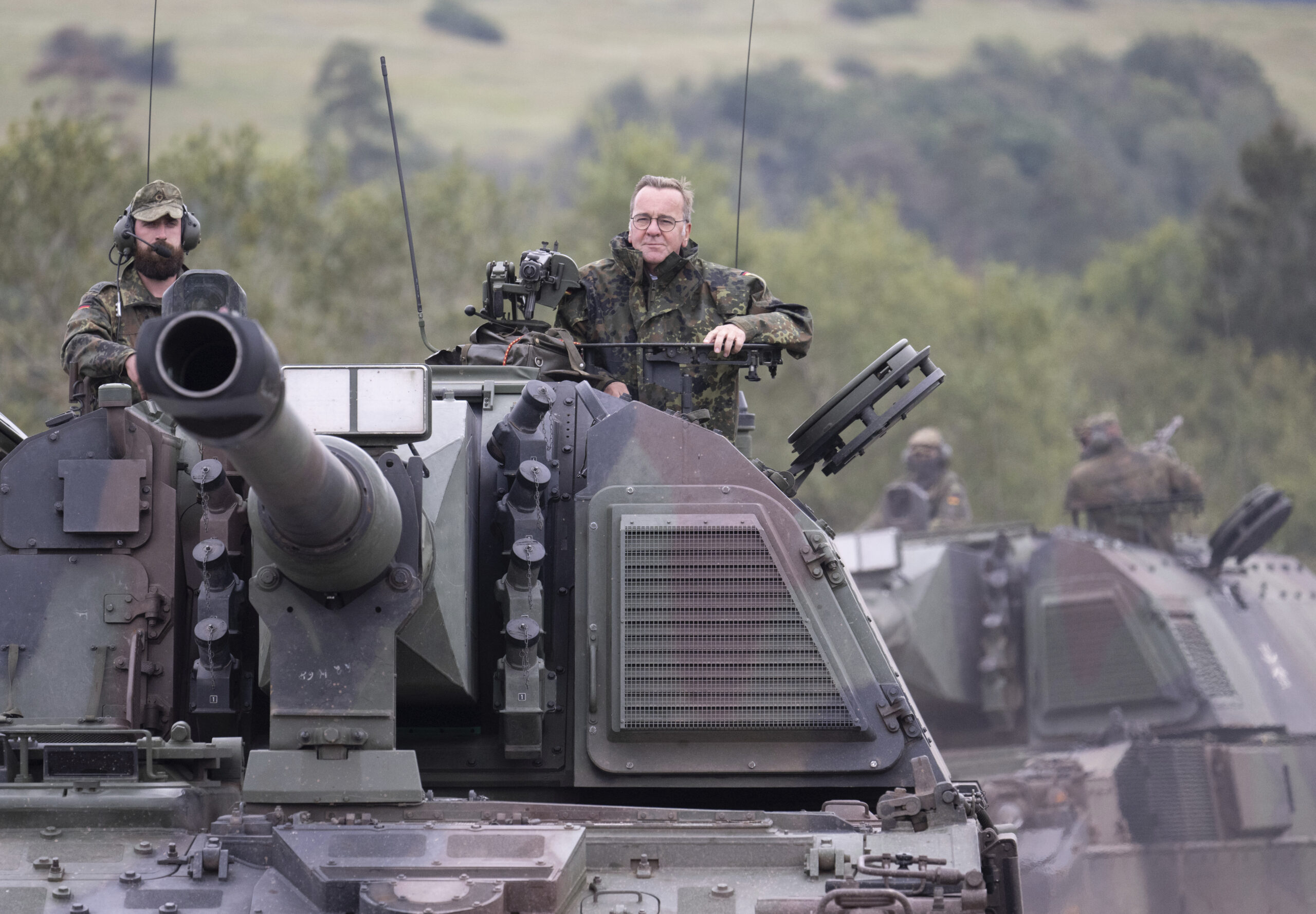 Tysklands forsvarsminister Boris Pistorius kjører med en stridsvogn under et besøk ved Bundeswehrs artilleriskole i Idar-Oberstein den 16. september 2024. Foto: Boris Roessler / DPA via AP / NTB.