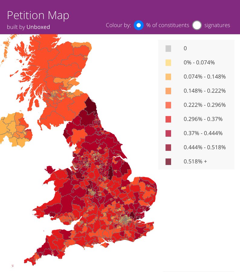 Selv i Essex, der støtten til Nigel Farages Reform UK-parti er på sitt høyeste, og i Lincolnshire, har en stor prosentandel av velgerne signert oppropet. Lavest støtte for folkeavstemningen finner vi i Birmingham og Londons valgkretser.