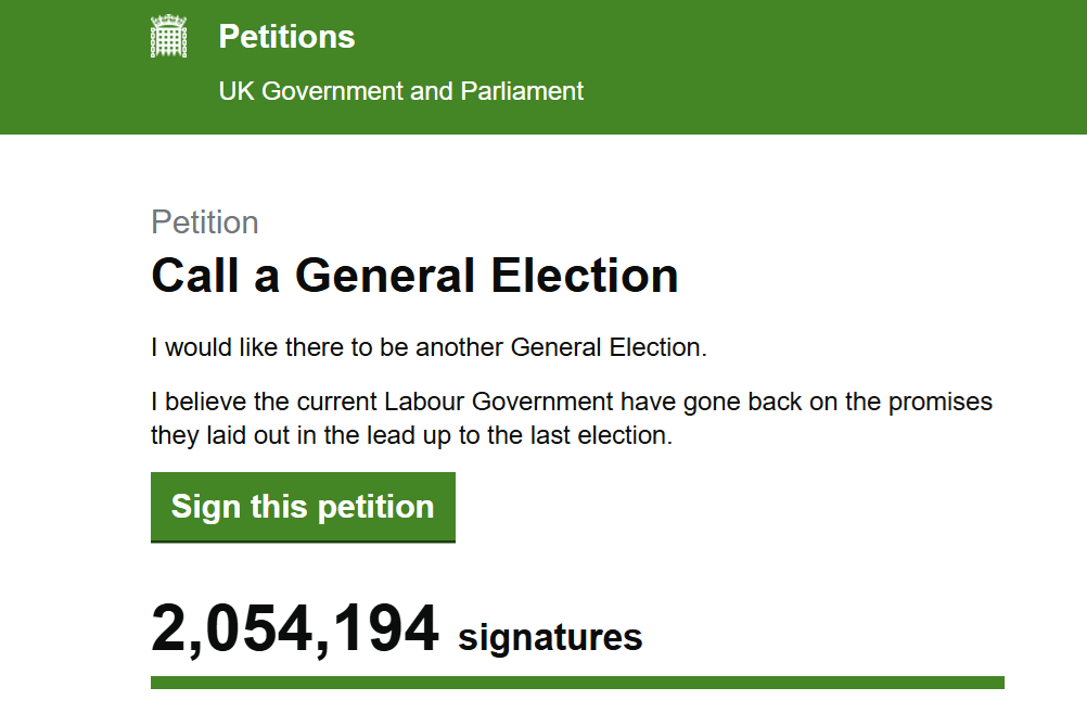 Misfornøyde briter krever nyvalg. Oppropet Call a General Election – Petitions ble startet for mindre enn en uke siden, men har allerede over to millioner underskrifter. Nå kan Keir Starmers regjering bli tvunget til å ta misnøyedebatten til det britiske parlamentet.