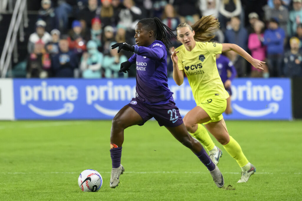 Orlando Pride forward Barbra Banda (22) runs past Washington Spirit defender Tara McKeown (9) during the second half of the NWSL championship at CPKC Stadium, Saturday, November 23, 2024, in Kansas City, Mo. (AP Photo/Reed Hoffmann)
