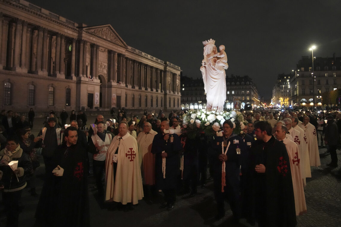 Et inntrykksfullt bilde: En statue av jomfru Maria bæres i prosesjon fra kirken hvor den har vært lagret og plasseres i den nyrenoverte Notre Dame-katedralen. Brannen var en katastrofe som kunne føles av troende over hele verden. Nå er gjenoppbyggingen i ferd med å bli fullført og vi får håpe at noen av de mest radikale ideene ikke er realisert. At kirken fremstår slik den var før brannen. Vi har ikke fått svar på hva som utløste brannen. Hva som fikk hundreårgamle eikebjelker harde som sten til å begynne å brenne. Kanskje vi aldri får vite det.