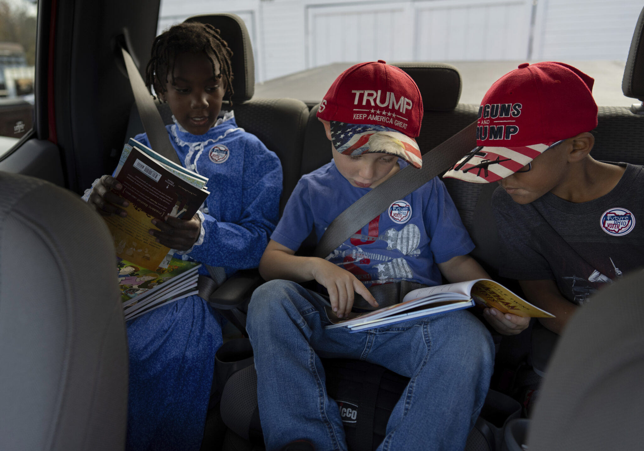 Gianna (7), Isaac (5) og Lucas (8) ser på bøker i baksetet på en lastebil der adoptivforeldrene Mike og Erin Young er på vei til et valglokale i Sunbury, Ohio, den 5. november 2024. Foto: Carolyn Kaster / AP / NTB.