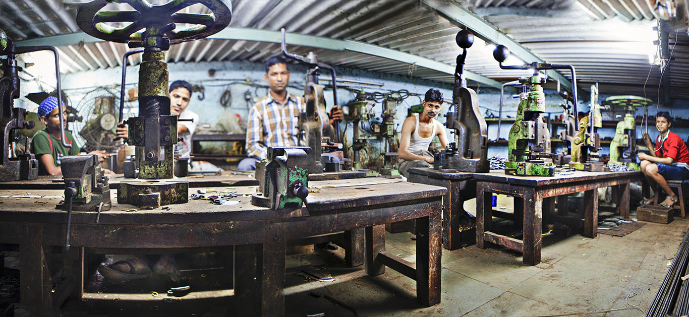 På fabrikkbesøk i Mumbais periferi 2011. Her stanset de knapper til verdens mest kjente jeans-merker. Foto: Arnt Jensvoll