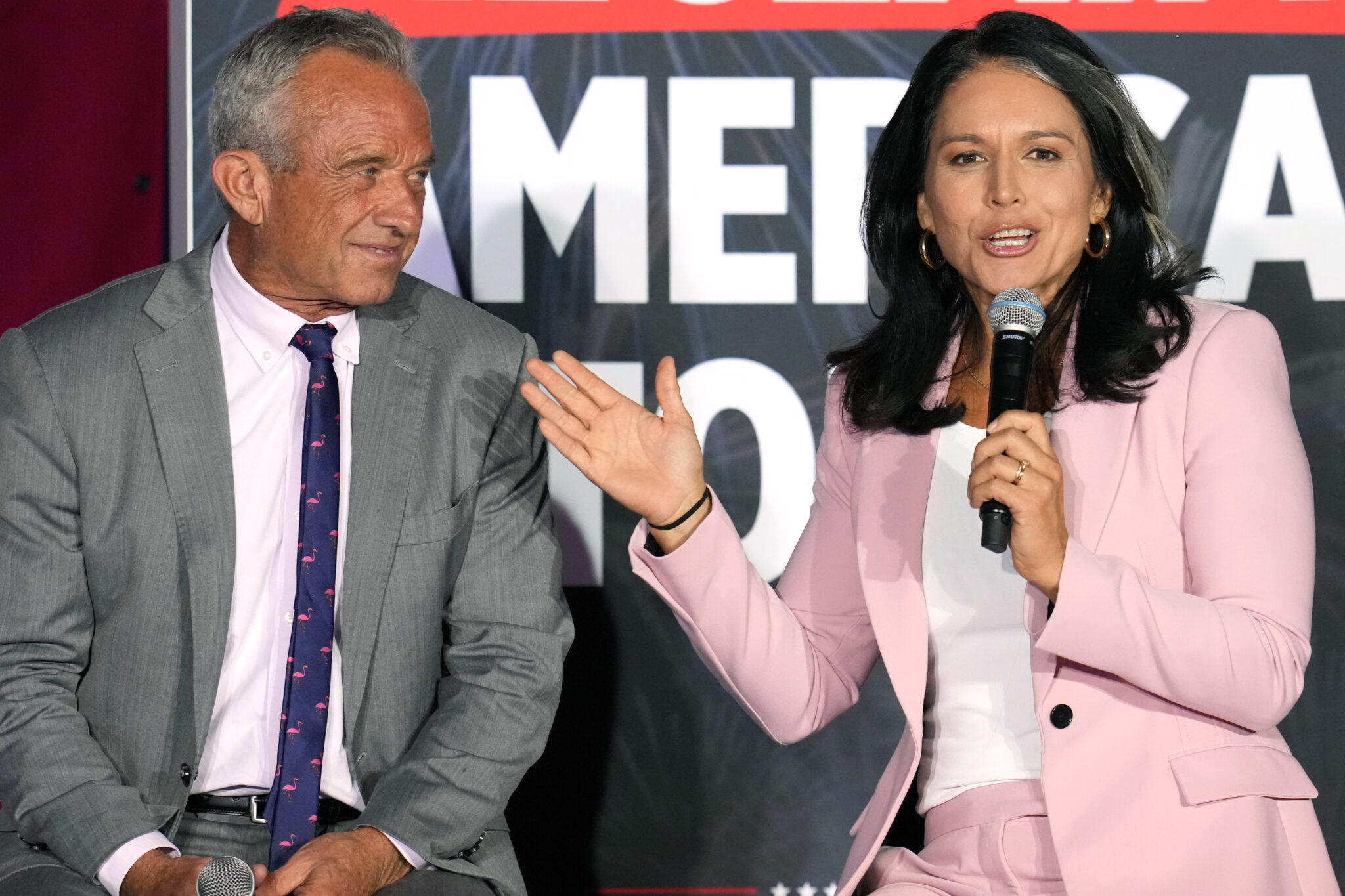 Tulsi Gabbard taler mens Robert F. Kennedy jr. hører på under et valgkampmøte for Donald Trump i Glendale, Arizona den 14. september 2024. Foto: Ross D. Franklin / AP / NTB.