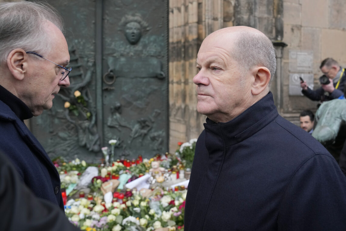 Forbundskansler Olaf Scholz så ut som en slagen mann da han spaserte gjennom byen og deltok i en minnegudstjeneste. Terroren slår til bare noen uker før valget i en delstat der AfD allerede har vist at de står sterkt.