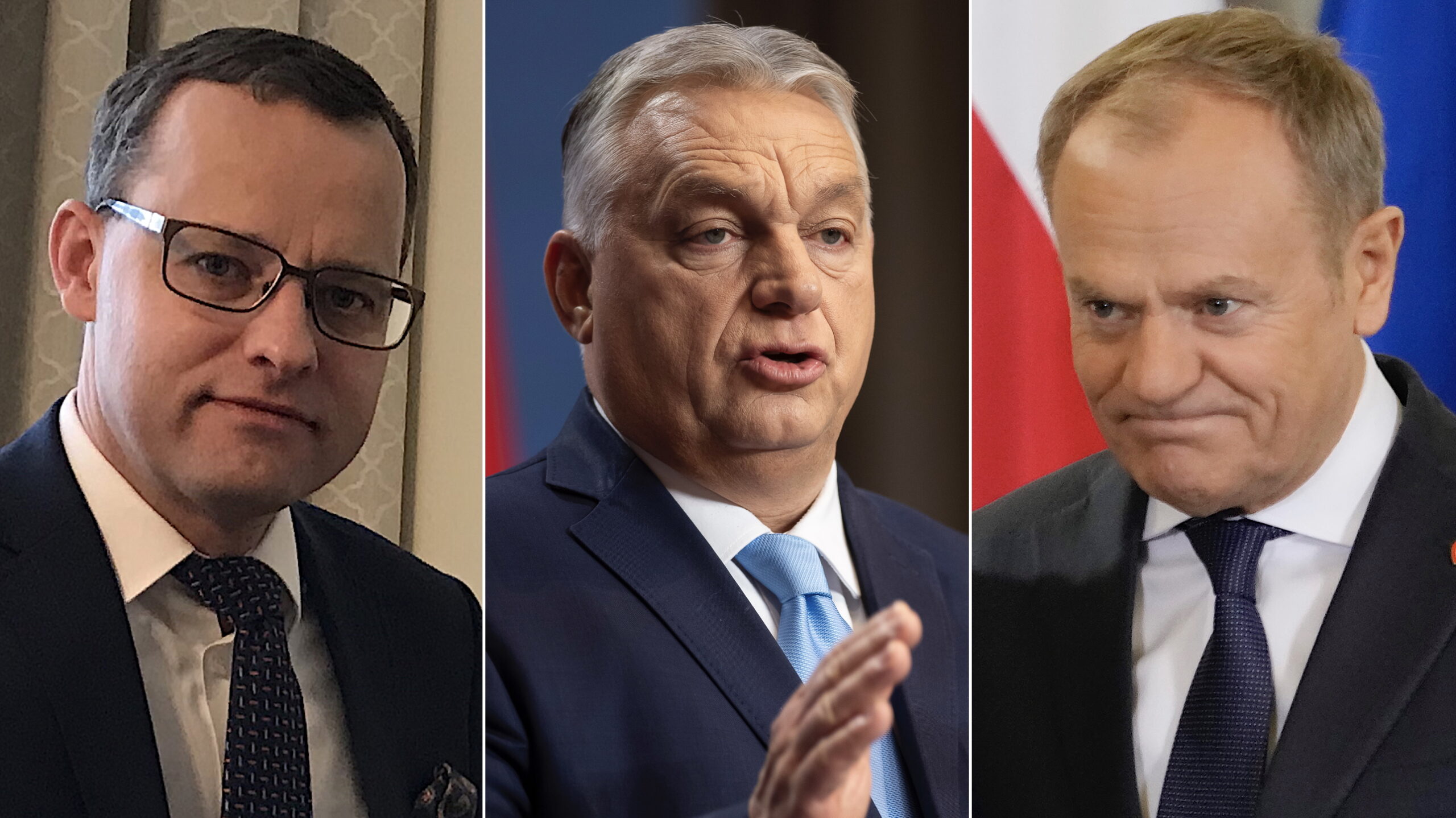 Marcin Romanowski, Ungarns statsminister Viktor Orbán og Polens statsminister Donald Tusk. Foto: Mylosz / Wikimedia Commons (cc by-sa 4.0), Denes Erdos / AP / NTB og Czarek Sokolowski / AP / NTB.