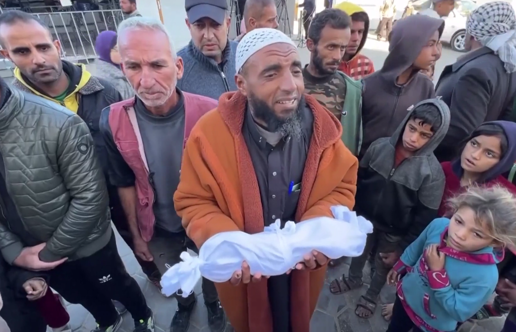 En video viser palestinske menn kledd i vinterklær sørge over et dødt spedbarn, omgitt av barbeinte barn med tynne klær.