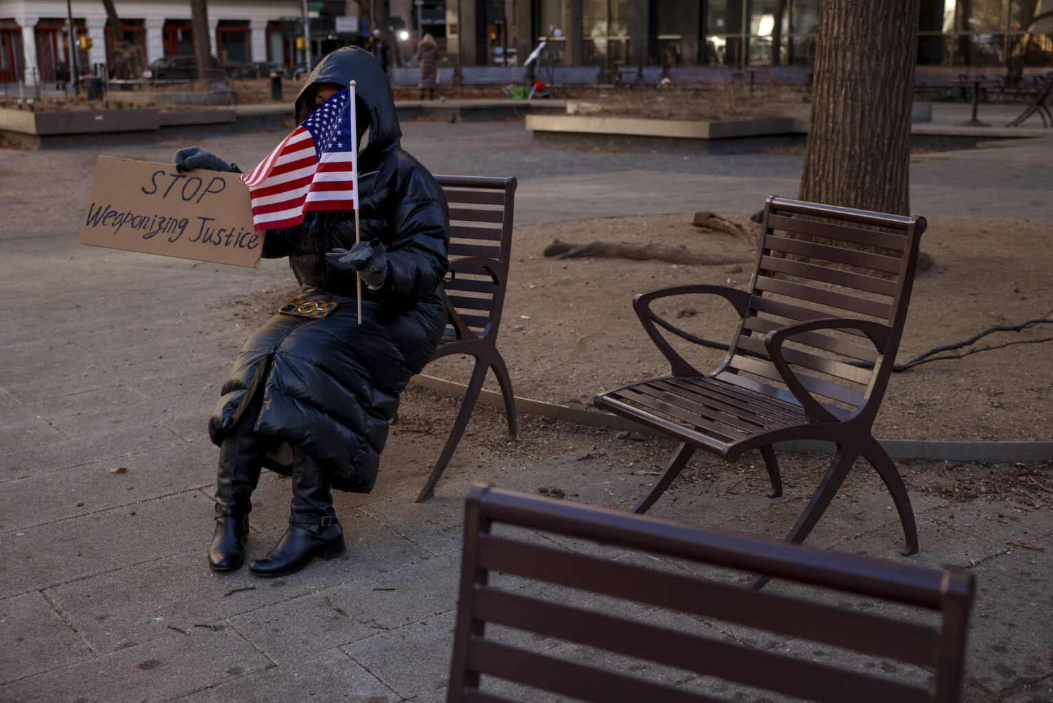 En kvinne demonstrerer mot bruk av rettsapparatet som våpen mot Trump utenfor en domstol på Manhattan der straffeutmålingen mot den påtroppende presidenten fastsettes den 10. januar 2025. Foto: Yuki Iwamura / AP / NTB.