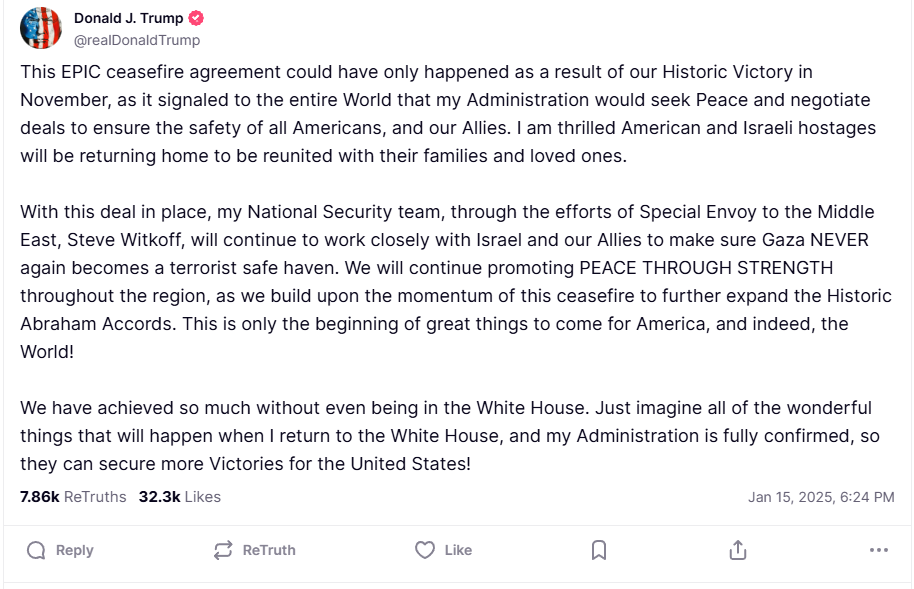 – Avtalen vil sørge for at gislene kan gjenforenes med sine familier etter 15 måneder, sier han videre.