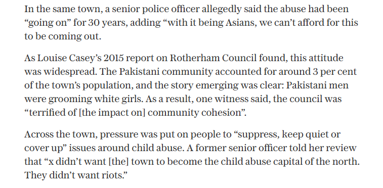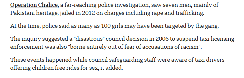 Politiets egen rapport fra West Midlands, skrevet i 2010, men holdt tilbake i flere år, avdekker at frykten for raseopptøyer veide tyngre enn ofrenes rettigheter. Disse jentene ble med andre ord ofret til brutale voldtektsgjenger for å unngå at pakistanernes følelser ble såret.