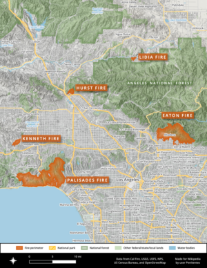 Kart over store skogbranner i California, 7. januar 2024. Kilde: Wikimedia Commons.
