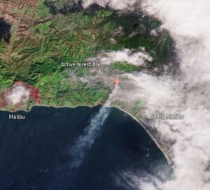 Satellittbilde av Pacific Palisades-brannen 7. januar kl. 10.36 lokal tid, kort tid etter at den hadde brutt ut. Kilde: Wikimedia Commons.