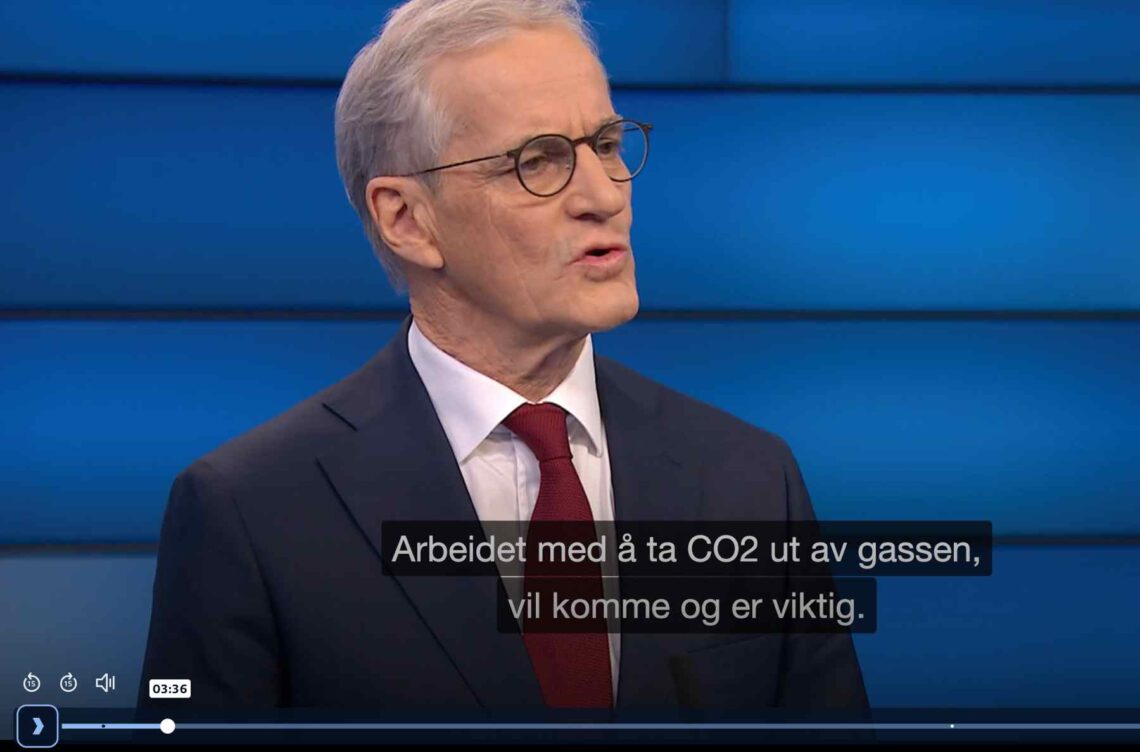 I det første klippet (nedenfor) mener Støre at Europa snart vil etterspørre «CO2-fri gass», og hevder at arbeidet med å «ta CO2-en ut av gassen» blir viktig.