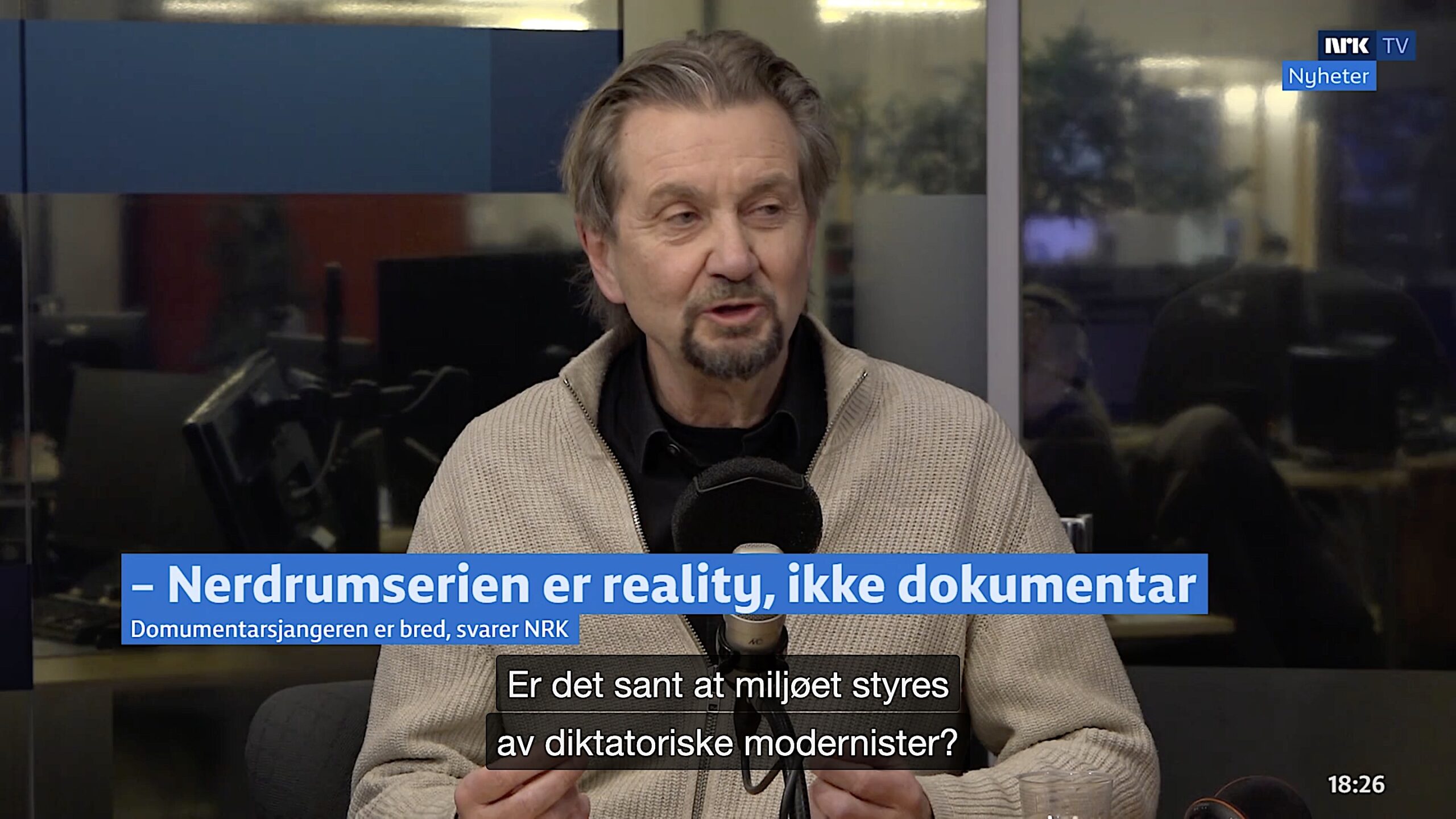Et innslag i Dagsnytt 18 mandag 13. januar om NRKs Nerdrum-serie fanget min interesse. Det var en debatt mellom journalisten Trygve Aas Olsen og kulturredaktør Ingerid Nordstrand. Temaet handlet om Nerdrum-serien var en dokumentar eller en reality-serie. Journalistisk sett er visst ikke Nerdrum-serien en dokumentar. Ifølge Aas Olsen er en rekke utrivelige forhold i kunstnerens livshistorie utelatt, slik at seriens vektlegging av familien Nerdrums dagligliv på gården fremstår som en seerredigert idyll.