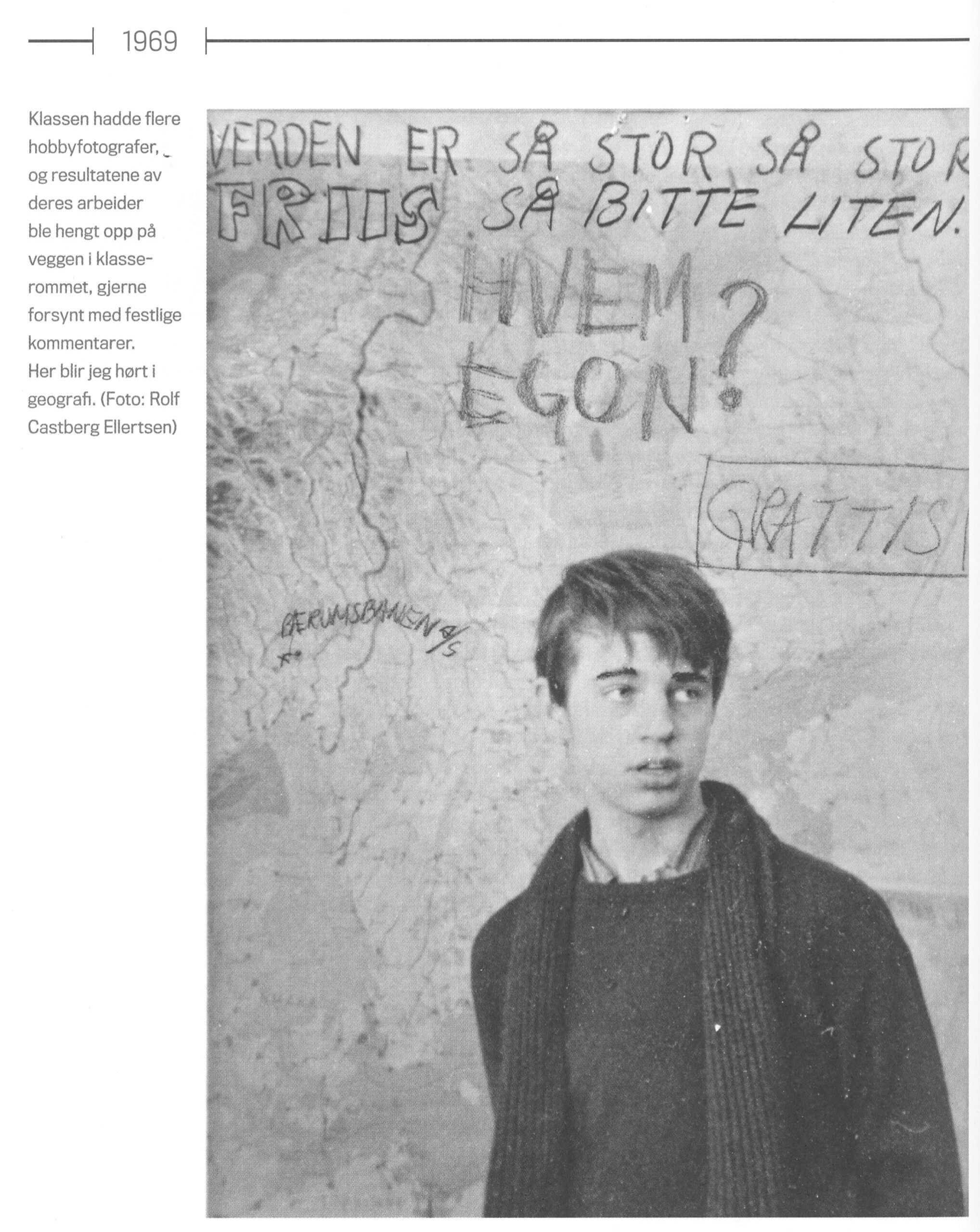 Rolfs fotografi av meg mens jeg blir hørt i geografi på Nadderud Gymnas tidlig vår 1969. Bildet er hentet fra boken «Beatles og jeg».