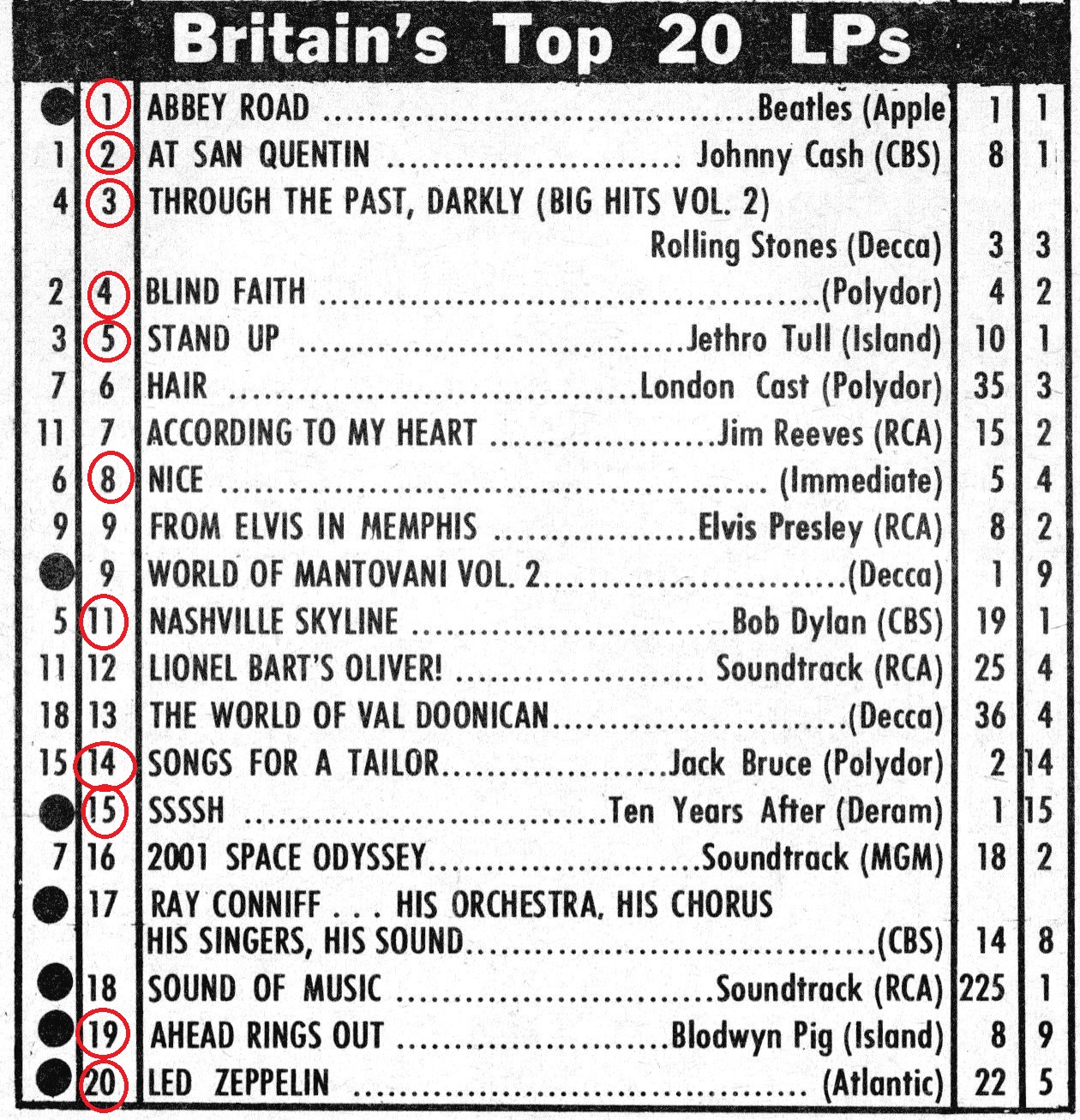 TOP 20 LP-listen i England første uken i oktober. Platene som er merket med rød sirkel, hadde jeg enten fysisk, på vinyl, eller ikke fullt så fysisk på lydbånd. Når man er fattig og 17 gjelds lydbånd.