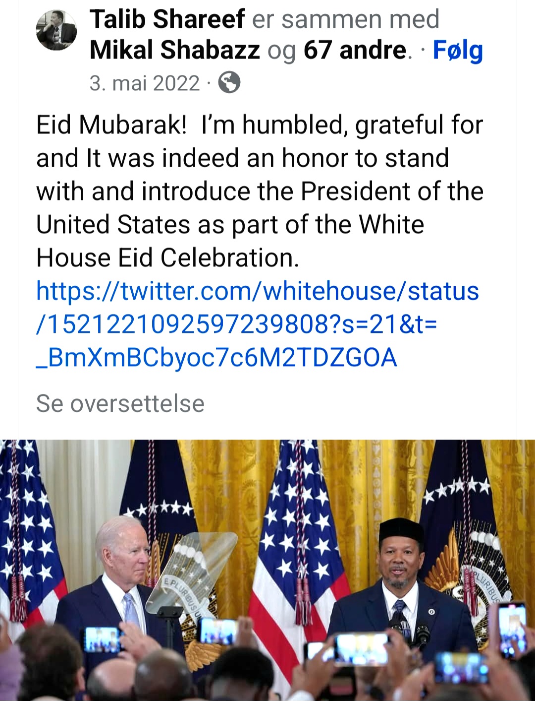 Imam Talib Shareef feiret eid med president Biden under eid-feiringen i Det hvite hus i mai 2022. Skjermdump.
