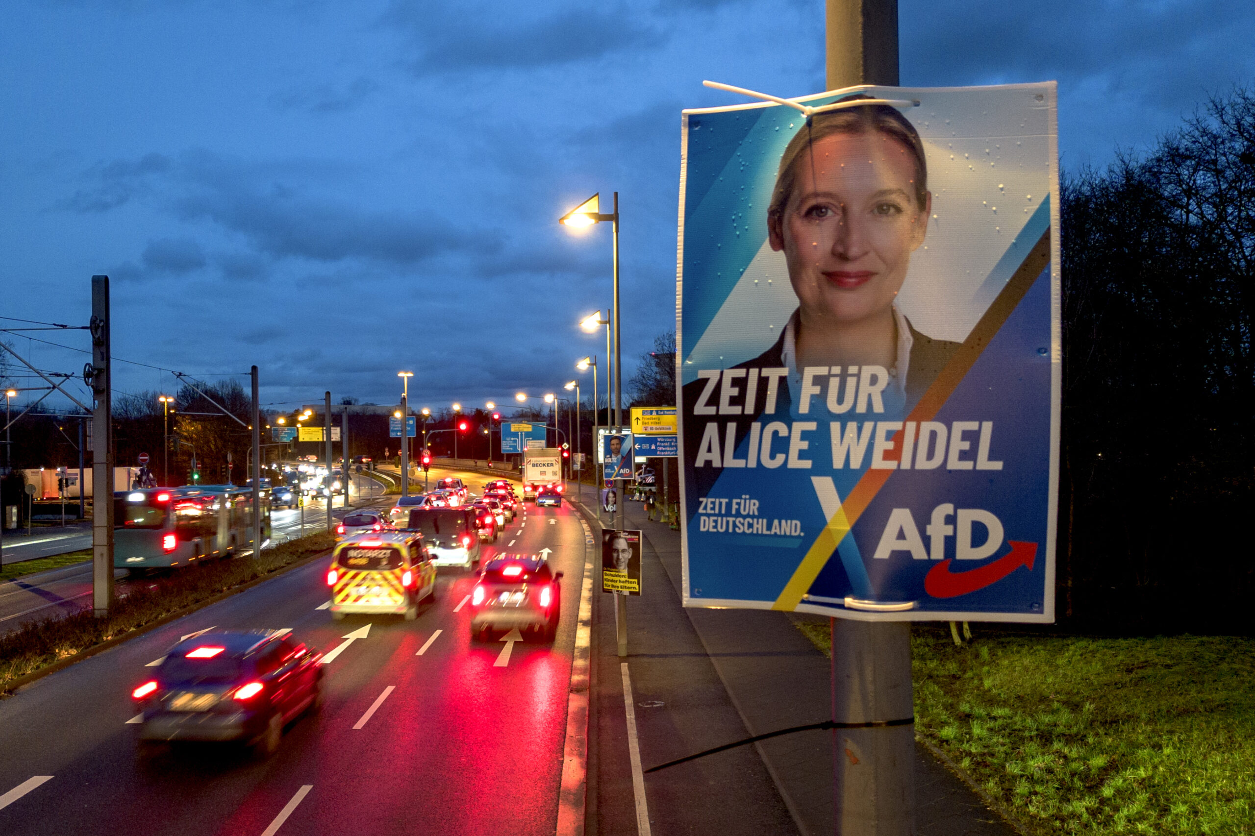 En valgplakat for AfD er festet til en lyktestolpe ved en motorvei i Frankfurt den 28. januar 2025. Foto: Michael Probst / AP / NTB.