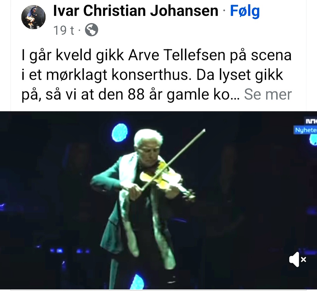 «I går kveld gikk Arve Tellefsen på scena i et mørklagt konserthus. Da lyset kom på, så vi at den 88 år gamle konsertfiolinisten var ikledd palestinaskjerf.»