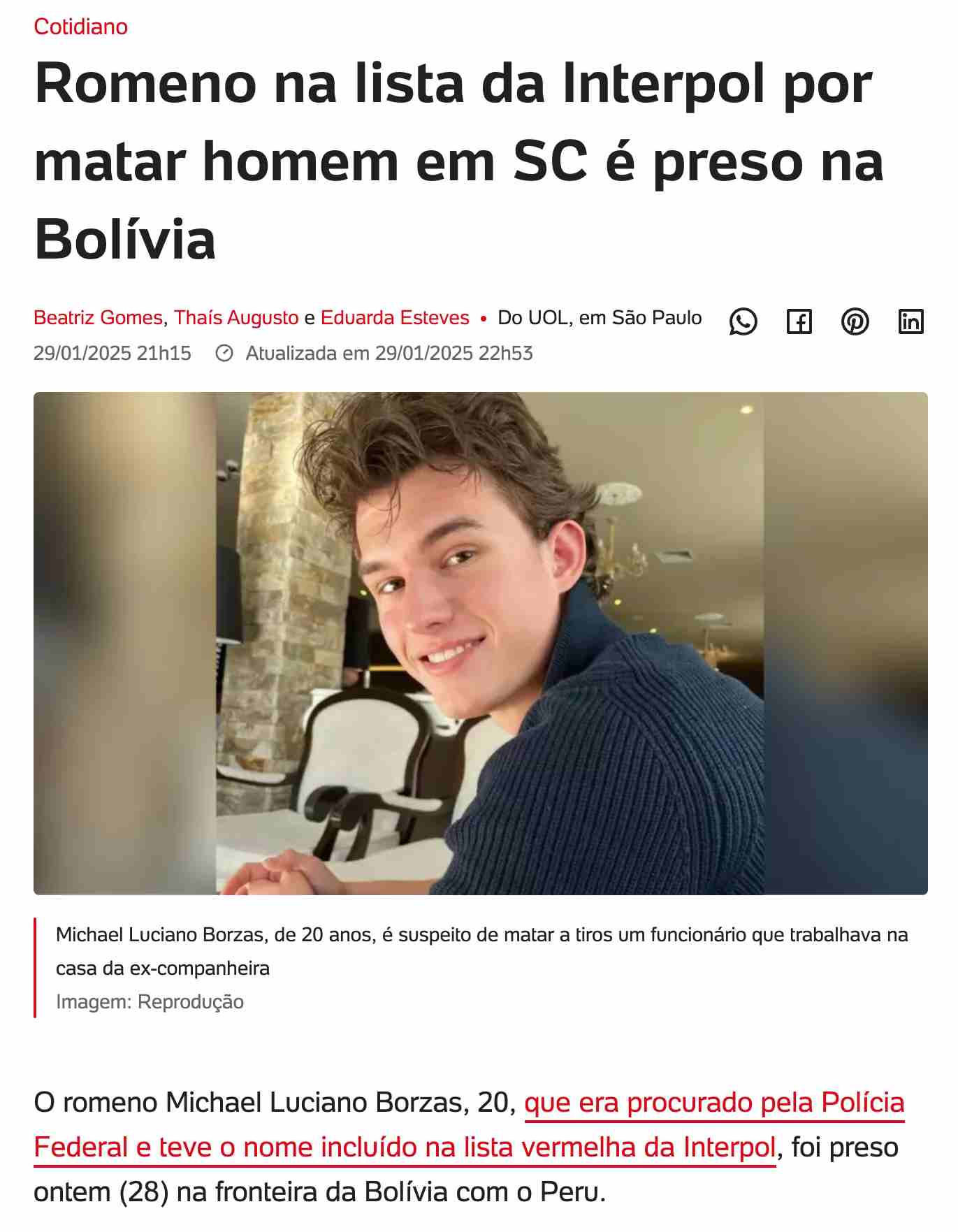 Også brasilianske UOL, et stort nyhetsmedium i Brasil, omtaler Michael Luciano Borzas som rumener. (Skjermbilde/Noticias UOL)