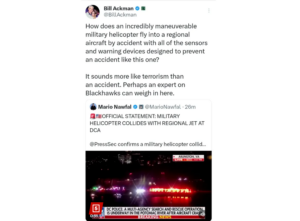 Milliardæren og den tidligere demokraten Bill Ackman slettet et innlegg på X der han tok opp muligheten for at flystyrten onsdag kveld kan ha vært resultatet av et terrorangrep, skriver New York Post.