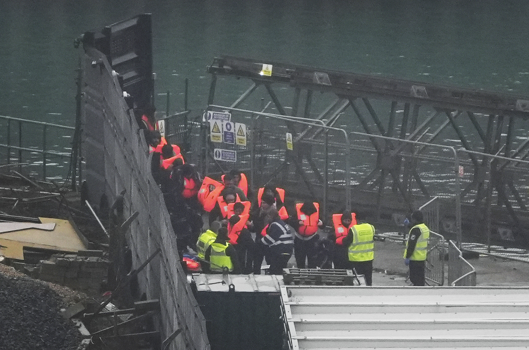 En gruppe migranter som er blitt ledsaget av et grensevaktfartøy til Storbritannia, går i land ved Dover den 22. januar 2025. Foto: Gareth Fuller / PA via AP / NTB.