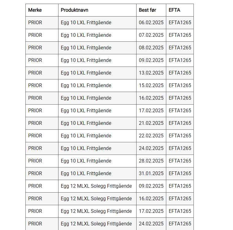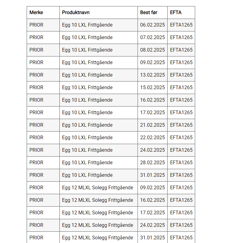 Torsdag kveld varslet Coop at de tilbakekaller en rekke eggprodukter. Senere fulgte Nortura opp med en lignende beskjed. Egg fra merkevarene Eldorado, First Price, Prima og Prior trekkes nå tilbake, samt flere produkter fra Coop.
