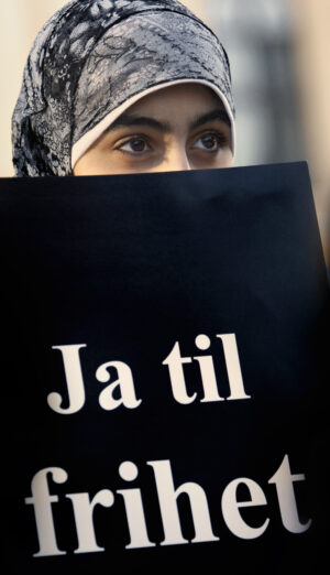 OSLO 20100213. En ung muslimsk kvinne bærer en plakat med påskriften «Ja til frihet» under en demonstrasjon mot muslimhets i Norge lørdag. Den unge kvinnen bærer det islamske hodeplagget hijab.