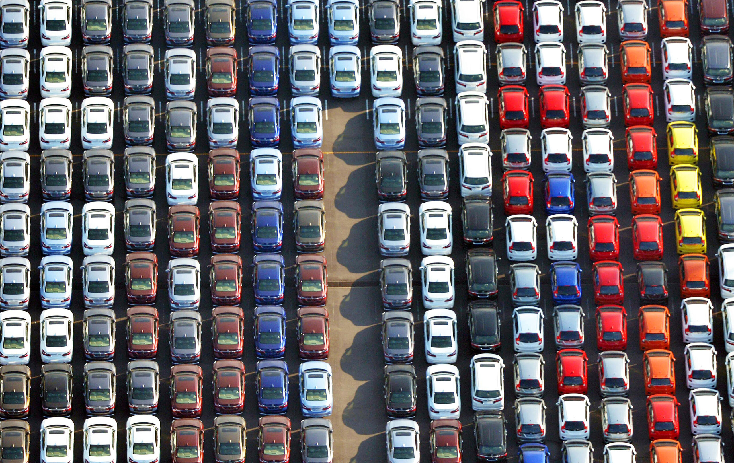 Biler står parkert på havnen i Yokohama i Japan i påvente av eksport. Foto: Kyodo News via AP / NTB.