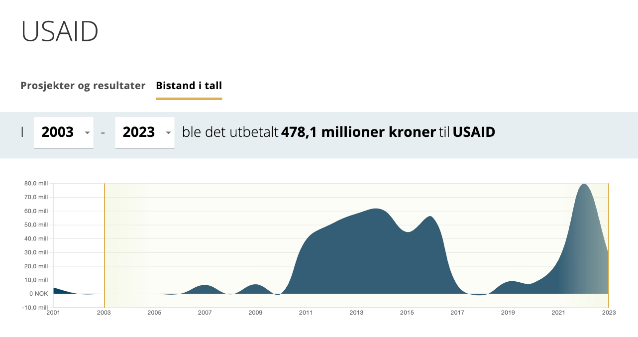 I 20-årsperioden fra 2003 til 2023 ga norske skattebetalere 478,1 millioner kroner til United States Agency for International Development (USAID). Hva summen var i fjor, ligger foreløpig ikke ute i Norads oversikt.