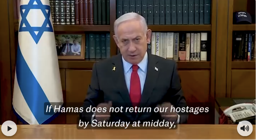 Benjamin Netanyahu sier at Israel vil gjenoppta krigen i Gaza dersom Hamas ikke frigir gislene innen lørdag klokken 12.00.