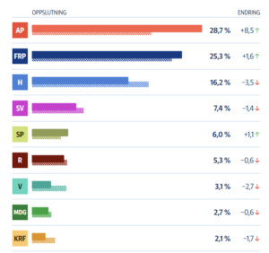 Av de borgerlige partiene er Fremskrittspartiet størst med 25,3 prosent, hele 9,1 prosentpoeng foran Høyres 16,2 prosent.