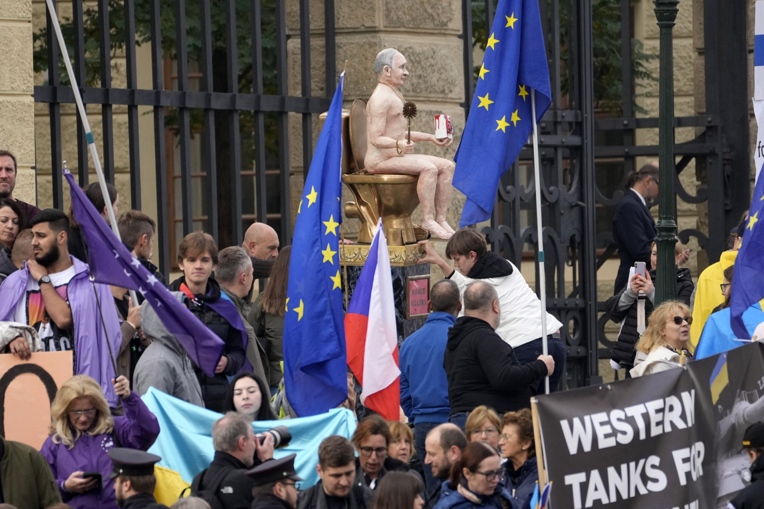 Demonstranter vifter med EU-flagg ved en skulptur som forestiller Putin under en demonstrasjon i forbindelse med EU-toppmøtet i Praha den 7. oktober 2022. Foto: Darko Bandic / AP / NTB.