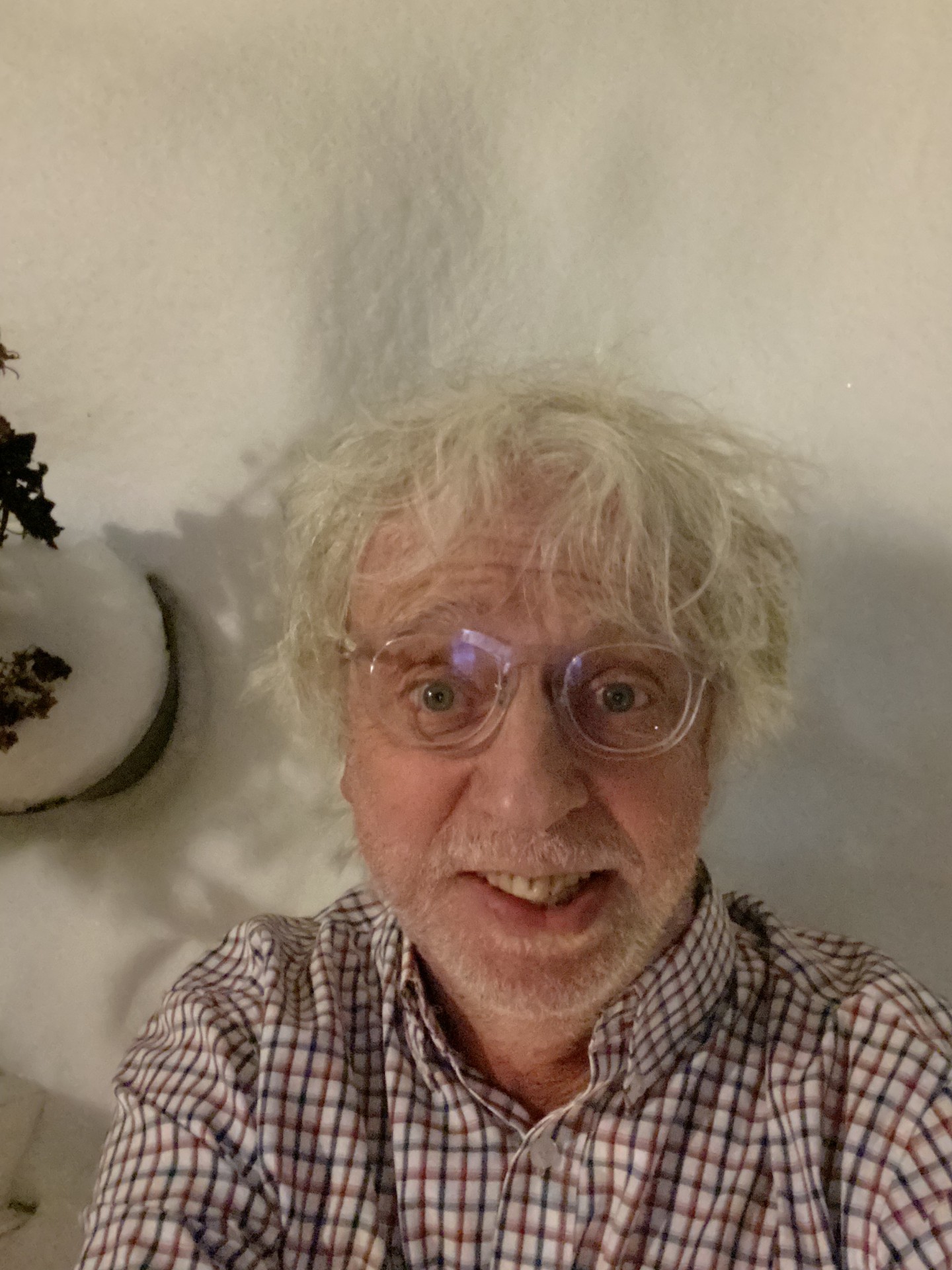 Selfie av antifriskusen i stabilt ryggleie på egen nedsnedd veranda nyttårsaften 2023. Sne egner seg best på TV.