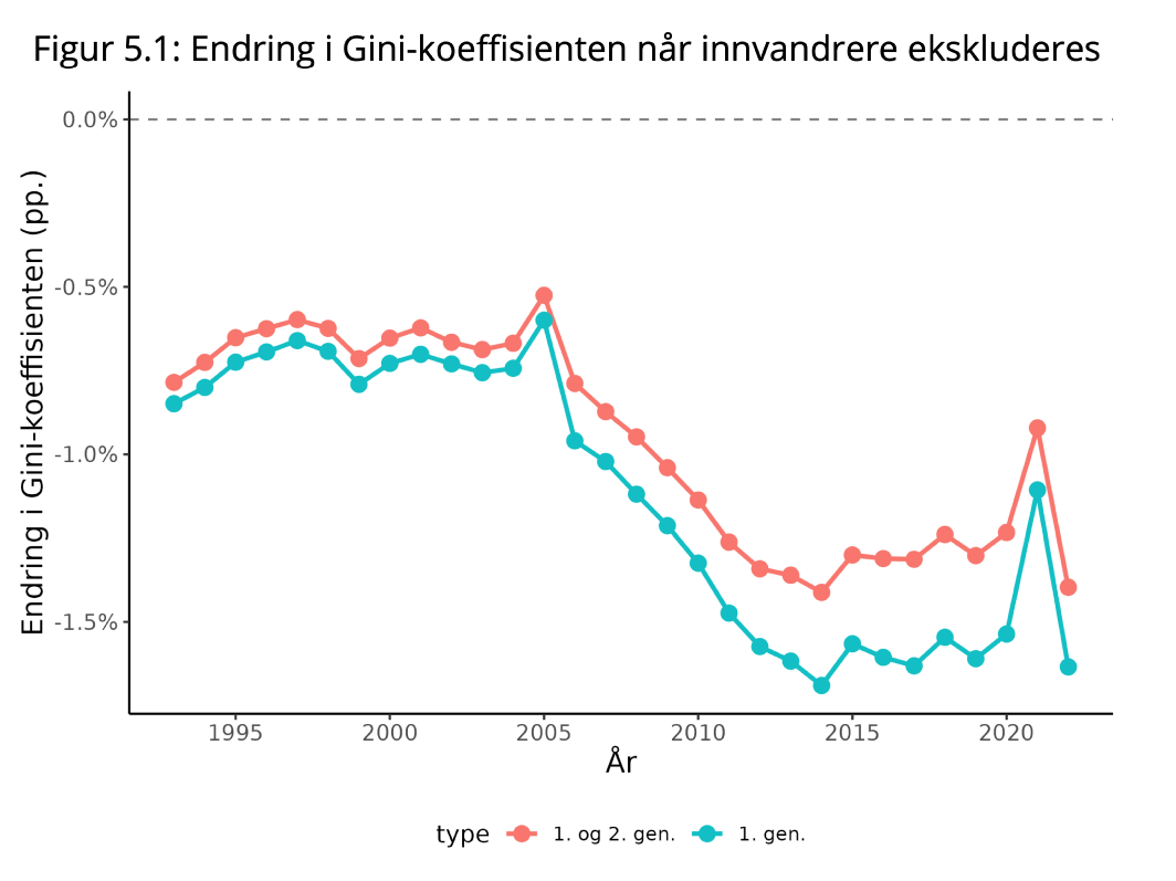 Ekskluderes førstegenerasjon fra beregningene, blir Gini-koeffisienten i dag om lag 1 prosentpoeng lavere enn den var i 2005.