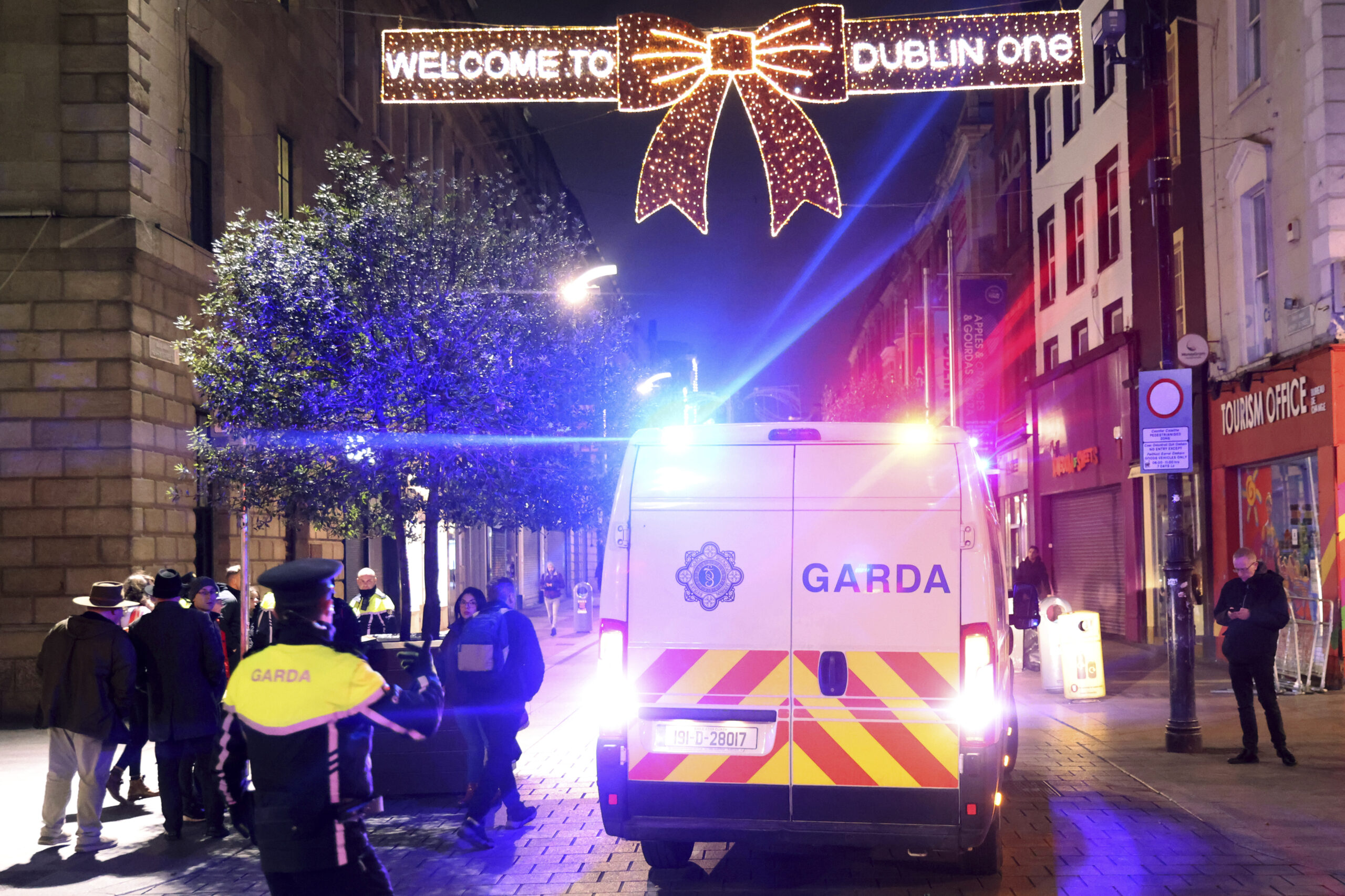 Politiet patruljerer i sentrum av Dublin under voldsomme protester mot masseinnvandringen til Irland den 24. november 2023, etter at tre små barn var blitt knivstukket i den irske hovedstaden. 34 personer ble arrestert. Foto: Peter Morrisson / AP / NTB.