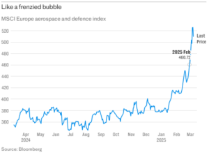 Hvis EU ruster opp slik Brussel ønsker, vil ordrebøkene til forsvarsindustrien snart være fulle. Problemet er bare at reaksjonen i aksjemarkedet begynner å ligne en vanvittig boble – og det er ingen tjent med, skriver Matthew Lynn i The Telegraph.
