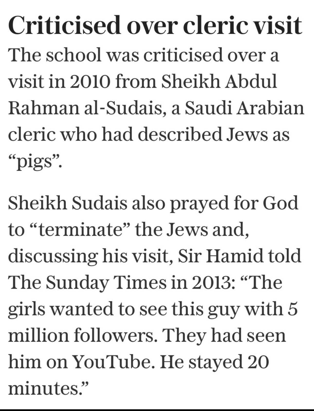 I 2010 inviterte Hamid Patel, til en britisk skole, Sheik Abdul Rahman al-Sudais, en antisemitt som tidligere hadde kalt jøder for griser og aper. I transkriptet fra Panorama-programmet fra BBC-dokumentaren «A Question of Leadership», sendt 21. august 2005, vises de uttalelsene fra en tale av Sheikh Abdur-Rahman Al-Sudais, en fremtredende imam fra den store moskeen i Mekka.