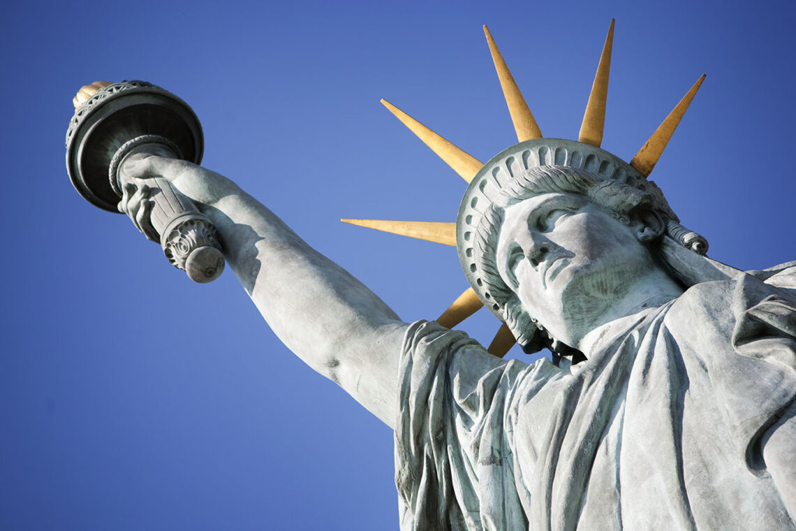 Statuen, designet av Auguste Bartholdi og konstruert med Gustave Eiffels hjelp, ble gitt av Frankrike til USA i 1886 for å markere deres allianse under den amerikanske revolusjon og har siden stått som et symbol på frihet på Liberty Island i New York.